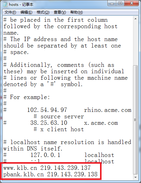 如您使用的是電信網(wǎng)絡(luò),請?jiān)凇癶osts”文件最后一行寫入“gz-dy.com空格219.143.239.137”換行“pbank.klb.cn空格219.143.239.138”,并保存、關(guān)閉文件,再重新訪問個人網(wǎng)銀。