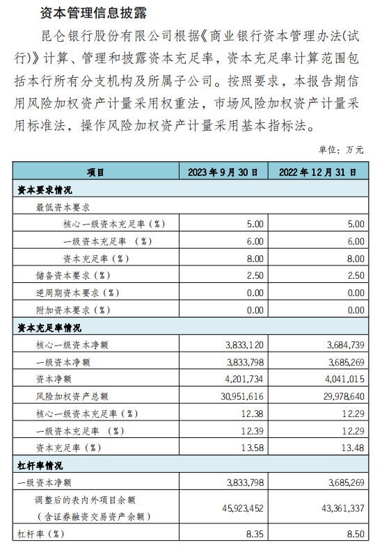 昆侖銀行股份有限公司2023年3季度信息披露